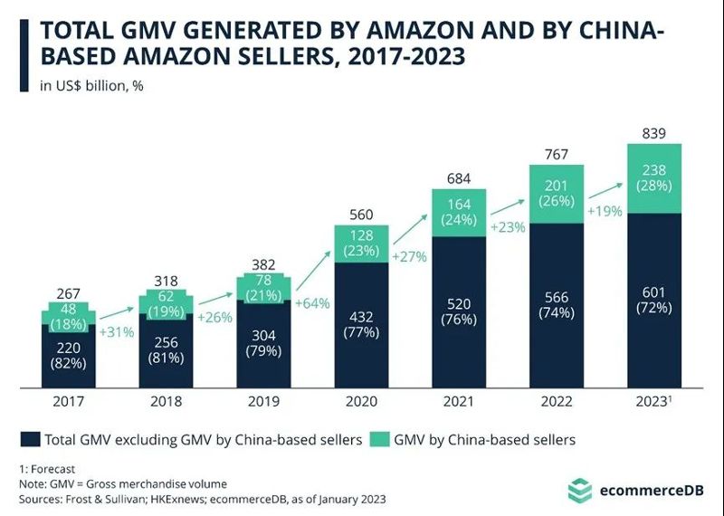 报告显示,2022年,中国卖家GMV达到了2010亿美元,占比为26%。预计到2023年,中国卖家GMV将达到2380亿美元,占亚马逊总GMV的28%。