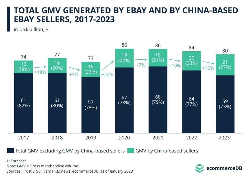 在另一电商巨头eBay上,中国卖家这一发展趋势与亚马逊大致相同。自2017年以来,尽管eBay总GMV一直处于波动状态,长期趋势甚至处于停滞,但中国卖家的发展并未受此影响。数据显示,尽管中国卖家GMV随着eBay总GMV波动发展,但其在eBay总GMV占比份额预计将从2017年的18%增加到2023年的27%,达到210亿美元。