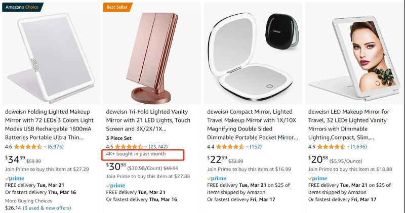 如下图,一款Bestseller的镜子显示,上个月销量为4000+(4k bought in past month)。这一信息,不仅在电脑桌面端有显示,同时也在手机等移动端显示。