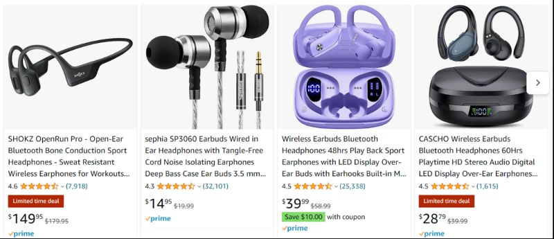 我们搜索“ear bud”等关键词,发现耳机类目的listing,几乎没有显示销量。