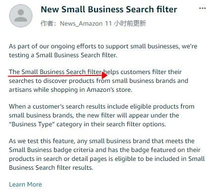 近日消息,亚马逊美国站在日前发布了公告称,为支持小型企业,平台正在测试小型企业搜索过滤器(Small Business Search),以增加小型企业品牌和工匠产品的曝光度。