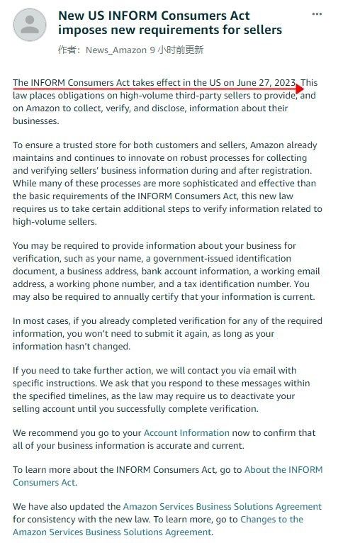 值得注意的是,亚马逊美国站近日发布公告称,INFORM Consumers Act(美国新INFORM消费者法案)将于2023年6月27日在美国生效。