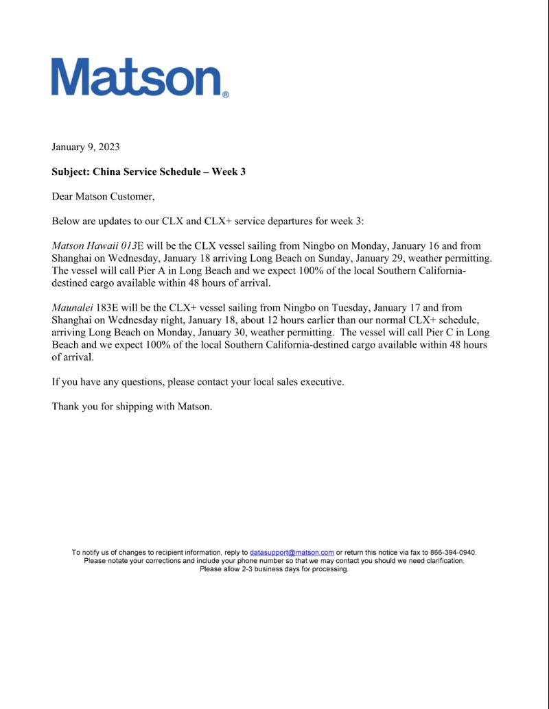 • Maunalei 183E 将作为CLX 船舶,于1月17日(周二)从宁波离泊,1月18日(周三)晚从上海离泊,预计会比我们正常的CLX 船期早12个小时左右,在天气允许的情况下,该船将于1月30日(周一)抵达美国长滩港的Pier C码头,我们预计100%长滩本港货物可在船舶到达后48小时内在港外堆场STE提柜。