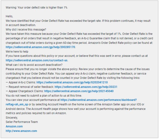 通常,受影响的卖家还会收到来自 Amazon Seller Performance 的以下电子邮件: